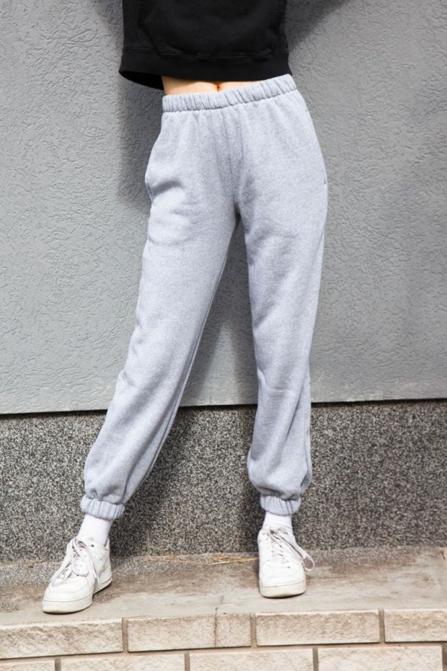Sweatpants are usually made of heavy cotton or polyester knit fabrics like Jersey, fleece or French terry. Fleece has a fuzzy and soft back while French terry has a loop composition on the back.